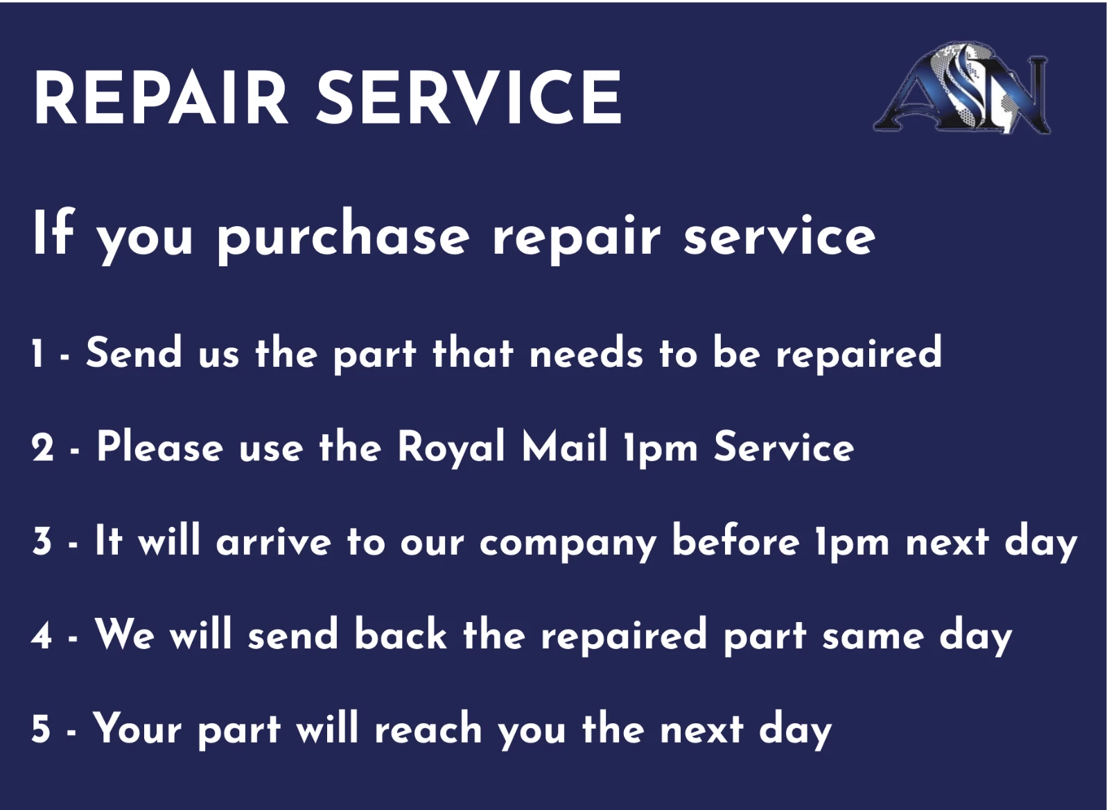 Please be aware that we will repair your part, no part will be sent to you from us. An email will be sent to you confirming your order, please note that it will state that your order has been dispatched but no part at this point will be dispatched, please send your part to us for repair.